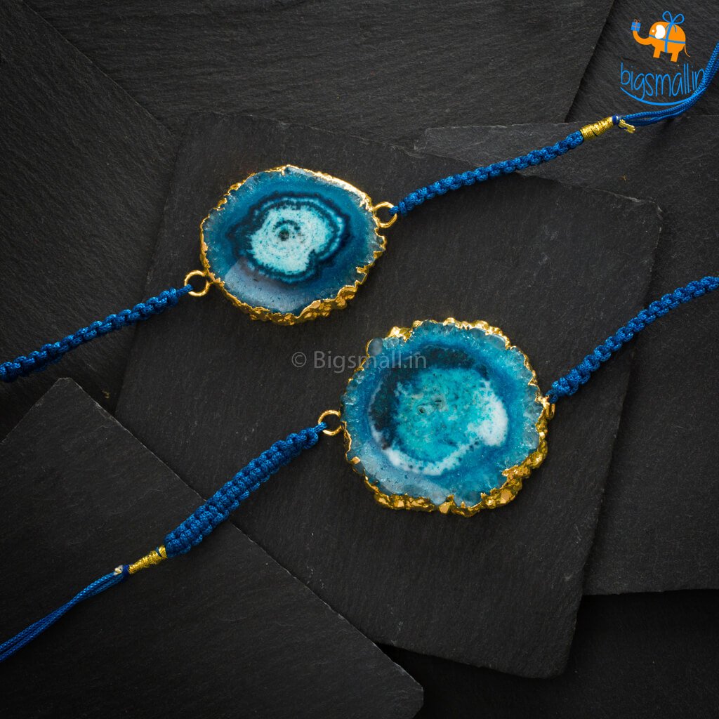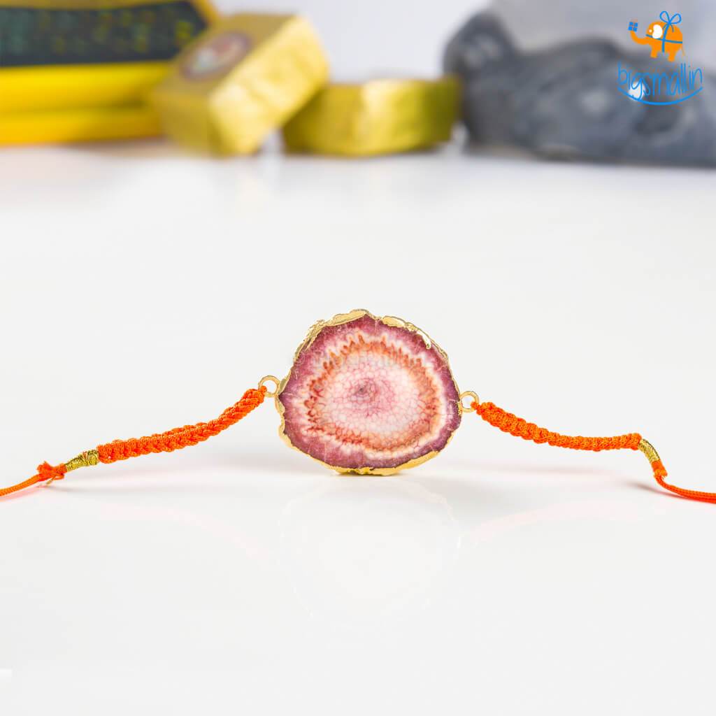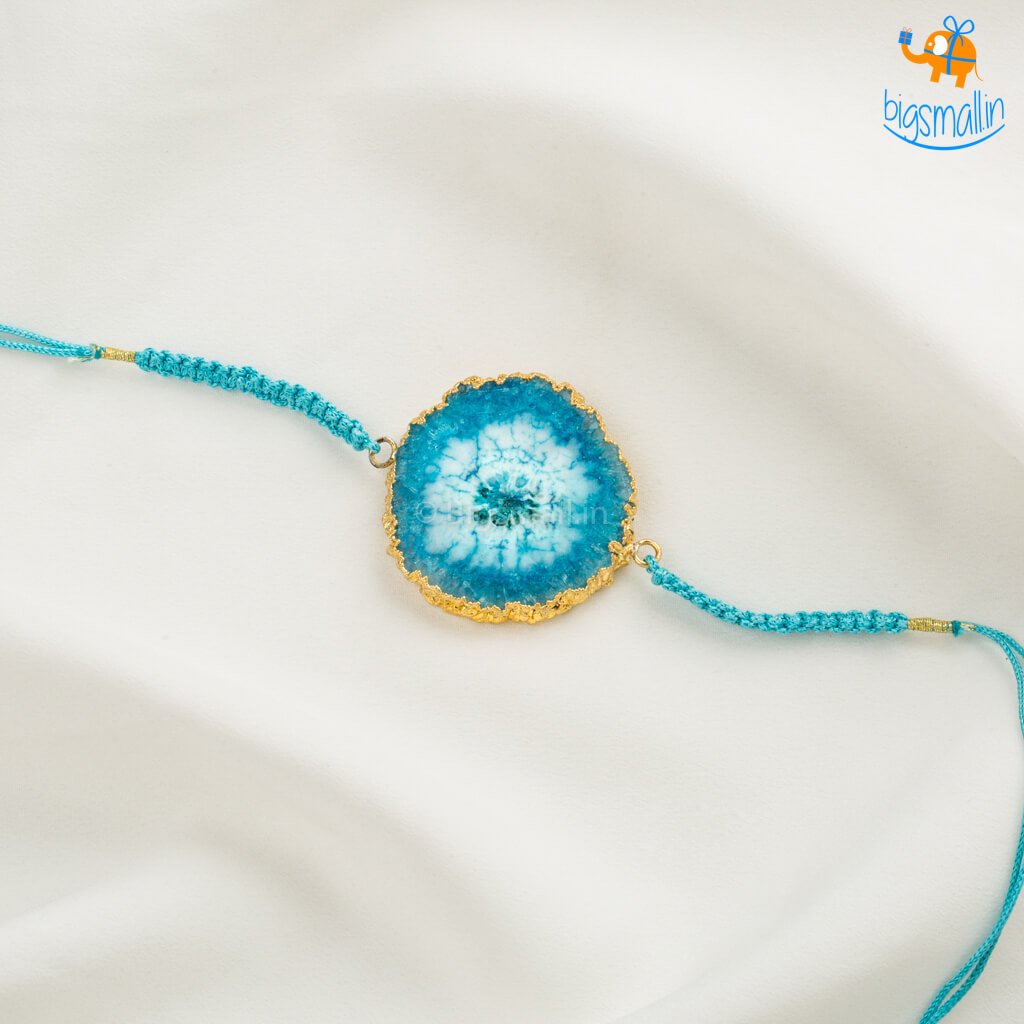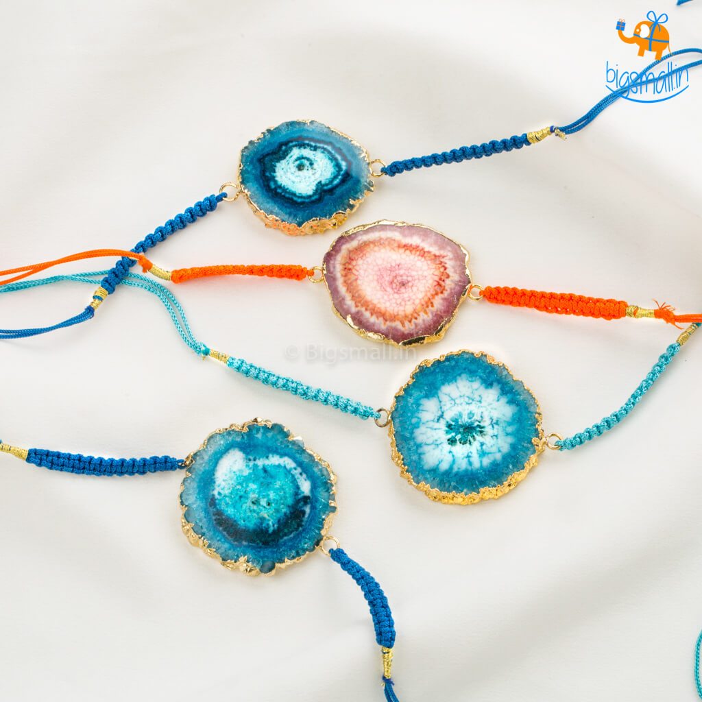 Yes, that's what brothers and this beautiful stone have in common, they both create a sense of security and safety. Agate stones are also said to calm oneself and heal inner tension. Steer away from regular rakhis this Raksha Bandhan and get your brother the best rakhi he deserves. Celebrate your undeniable strong bond with this unique rakhi. The rakhi is threaded in the beautiful bright coloured string. The stone size and shape may differ slightly as they are natural stones.