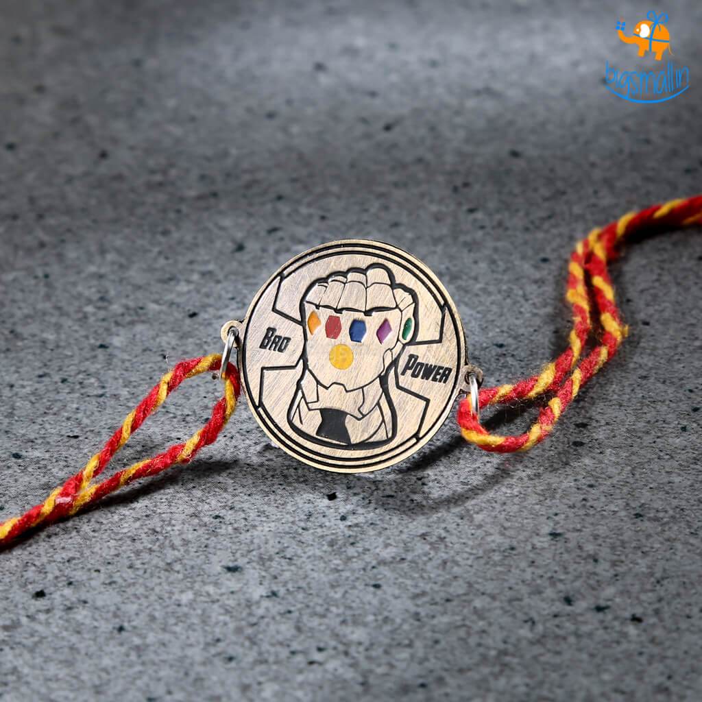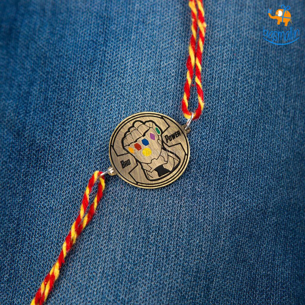 If you remember saying, "You don't know who my brother is!' every time someone dare mess with you, you would relate to the, Bro Power Rakhi. With a brass sheet embellishment, depicting the Infinity Stone gauntlet, this endearing rakhi is designed to delight and cement your bond of love further. One click of the wearer's fingers and all the wrongdoers will perish.
