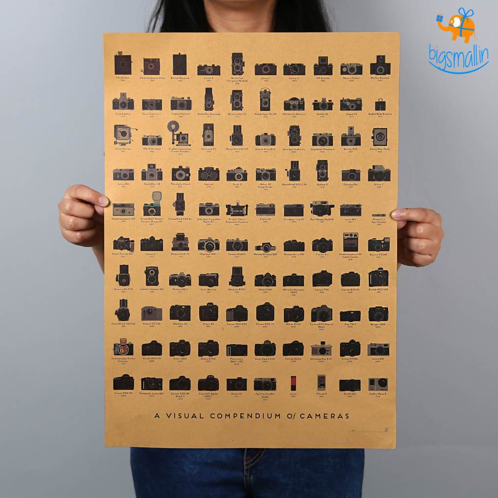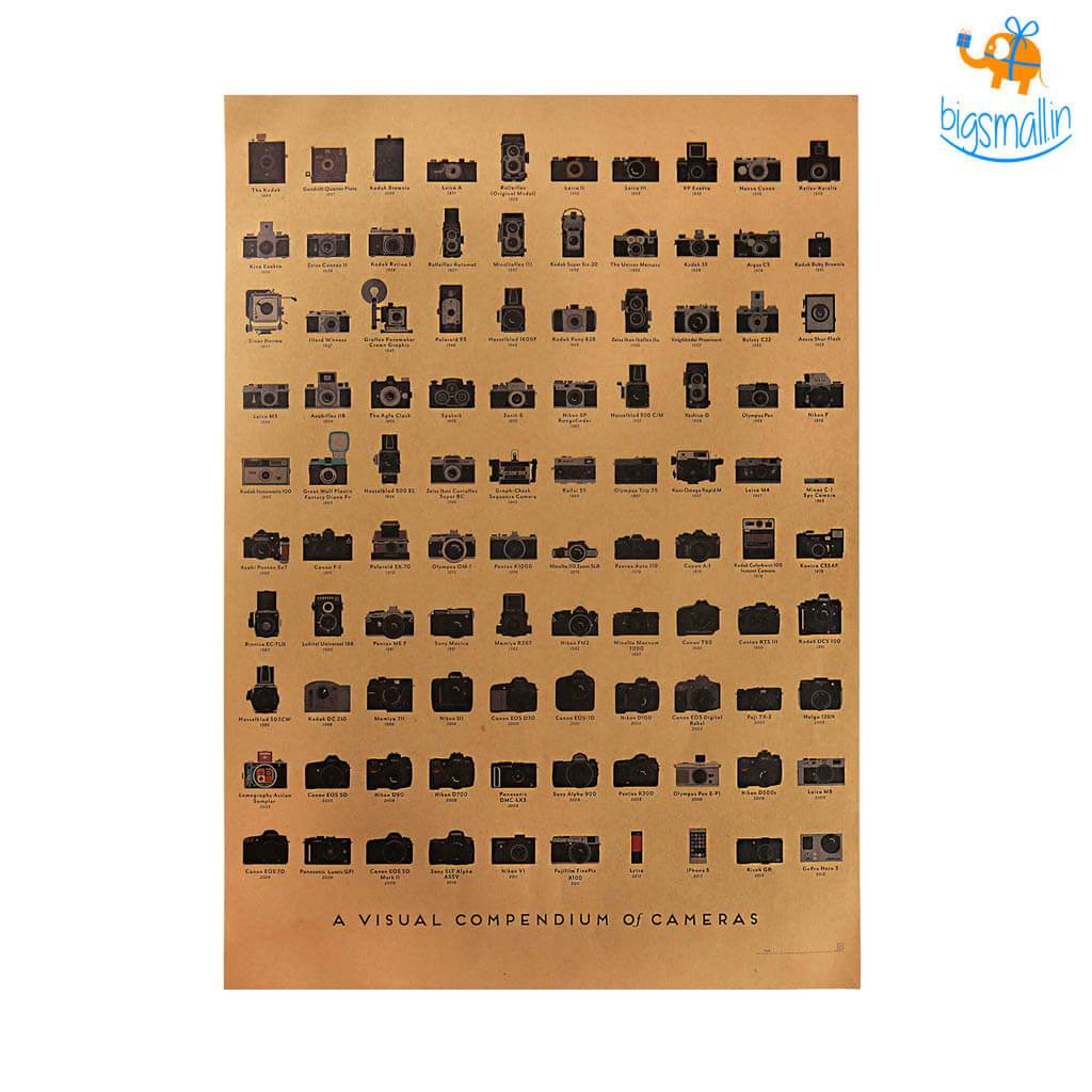Every photography enthusiast would agree that to click a good picture you must have a good feel of the instrument. We bring to you a compiled visual compendium of cameras Kraft paper poster. This chronicles the evolution of cameras from The Kodak, 1888 to GoPro Hero 3, 2013. The iPhone 5, 2012 edition also finds mention. It includes a pictorial representation of 100 cameras. A perfect gift for photography enthusiasts and a cool home decor collectible. Printed on good quality Kraft paper, this one is a definite conversation starter.