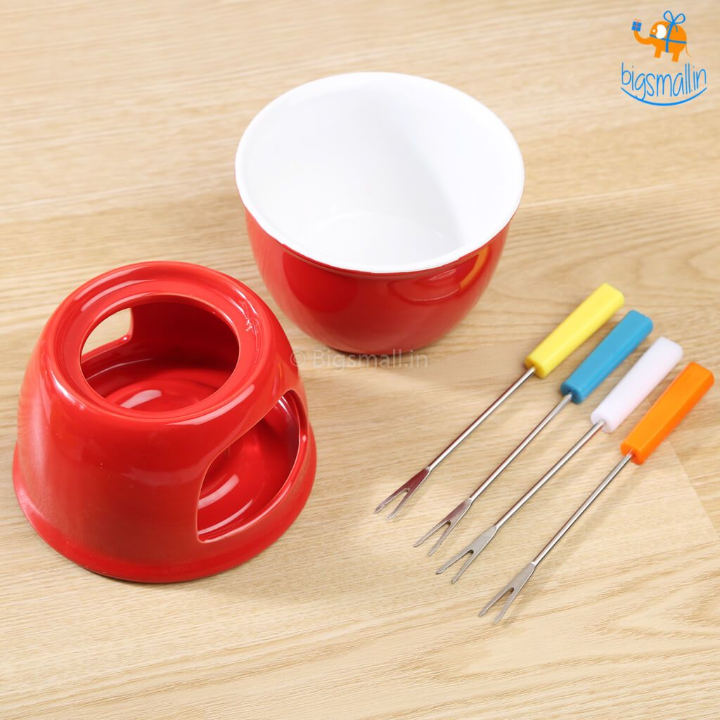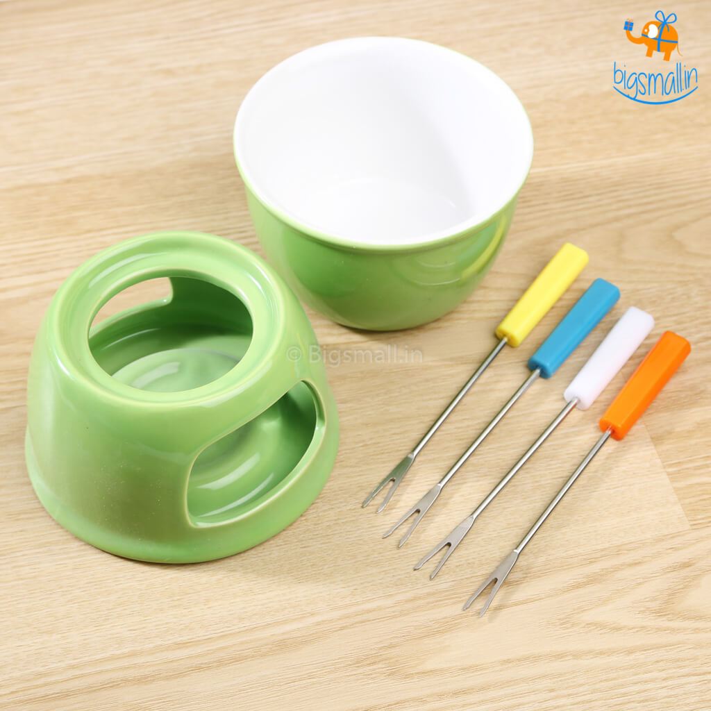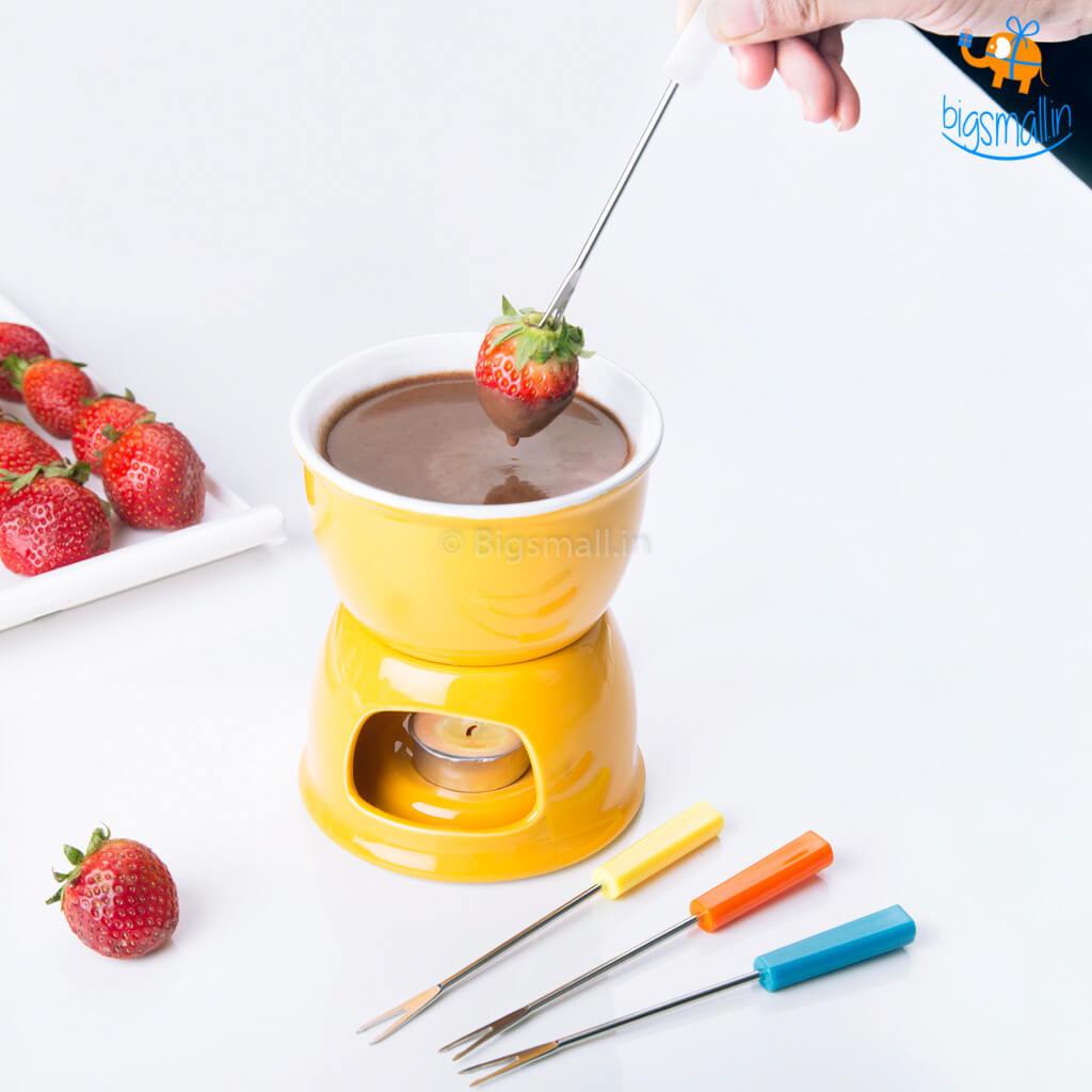Caught that? If not then that's alright, think it over while having sweet sweet strawberries dipped in hot chocolate syrup. You heard us right. Now you can have fondue right on your dinner table with this set. Get it for when friends are over and eat fruits dipped in chocolate or bread dipped in bubbling cheese, whatever sails your boat. The set comes with a pot and a base where you can keep a tea light to keep your cheese simmering. The set also includes 4 multicolored skewers. A great gift for a foodie friend or get one for yourself and throw an awesome house party.