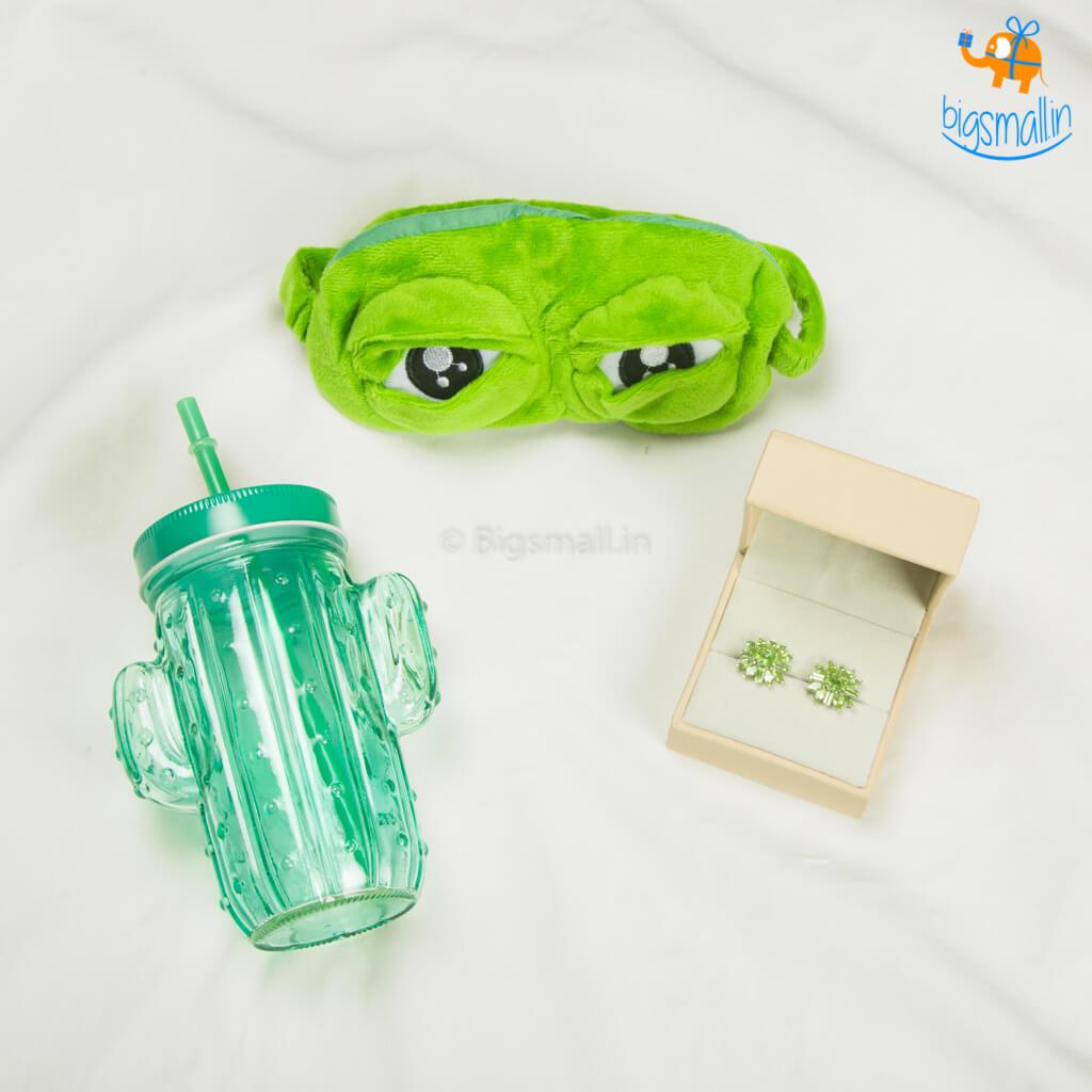 - Includes Cactus Mason Jar, Kapruka Semi Precious Earrings and 3D Plush Frog Eye Mask