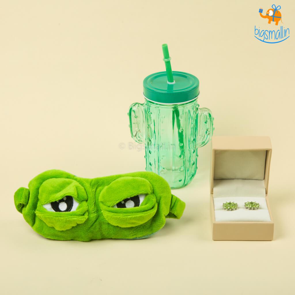 Presenting a gift set as cool and laid back as her. Chill Gift Set for Her is inclusive of Cactus Mason Jar, Kapruka Semi Precious Earrings and 3D Plush Frog Eye Mask.
