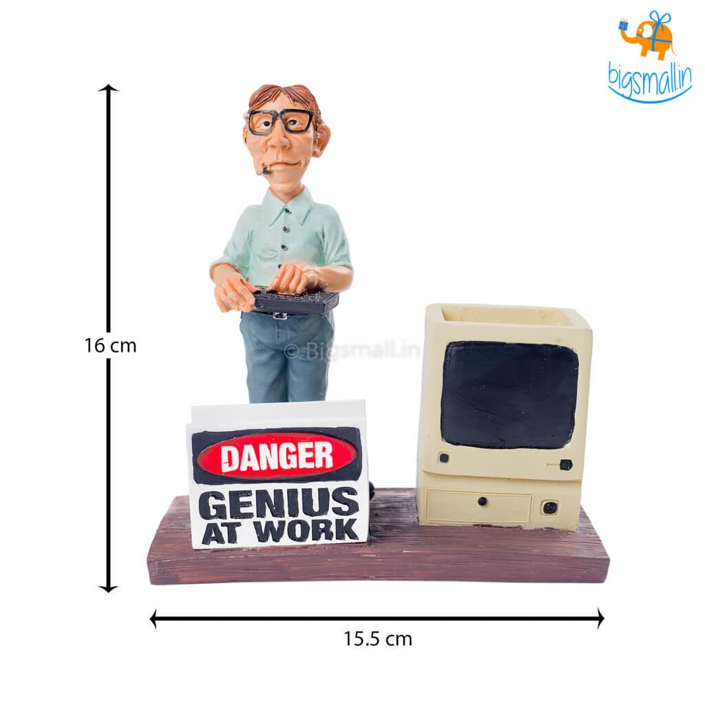 • Designated business card holder that says "Danger: Genius at Work"