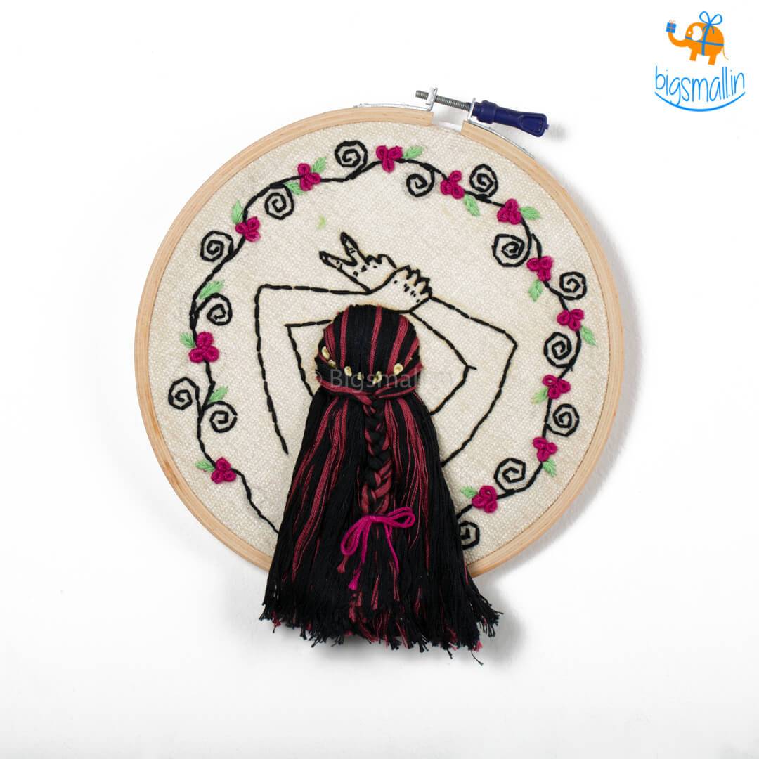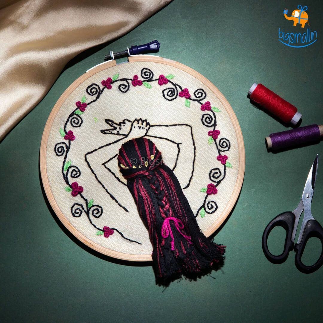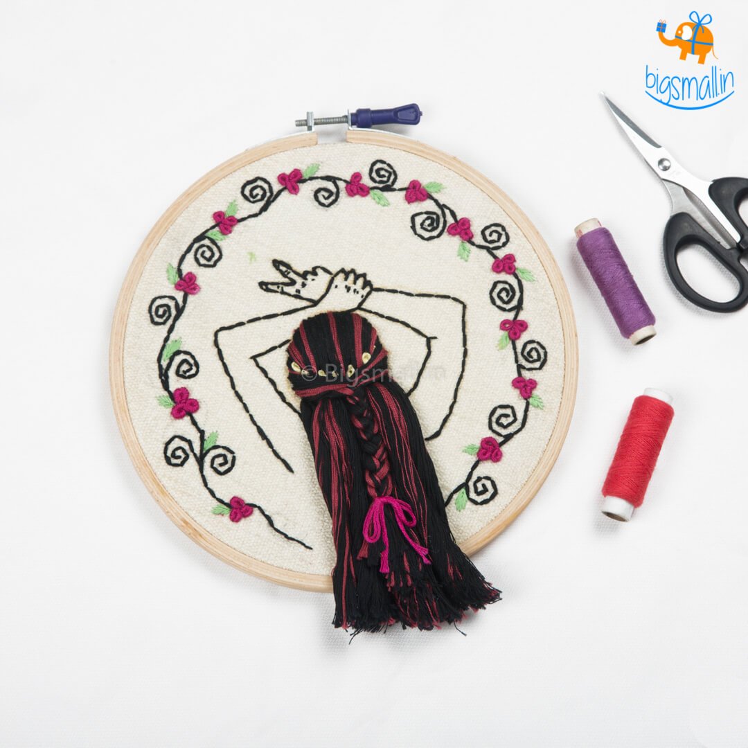 Presenting traditional art and a relatively new creative way to present it. The boho-girl embroidery hoop art will light up any corner you decide to hang it upon. The embroidery is done with bright coloured threads on an off-white fabric, making the design pop. The colourful flowers and hair make the design look more cheerful. You can easily hang the hoop with the support of the screw and nut. The hoop will look great placed on a bookcase or hanged above your coffee table. Gift the art to an embroidery enthusiast or somebody who likes to display decorated textile in their home.