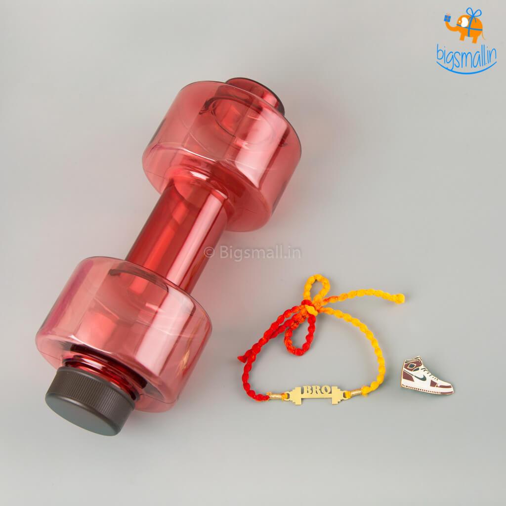 - Gift set includes: Gym Bro Rakhi, Dumbbell Water Bottle, Nike Shoes Lapel Pin