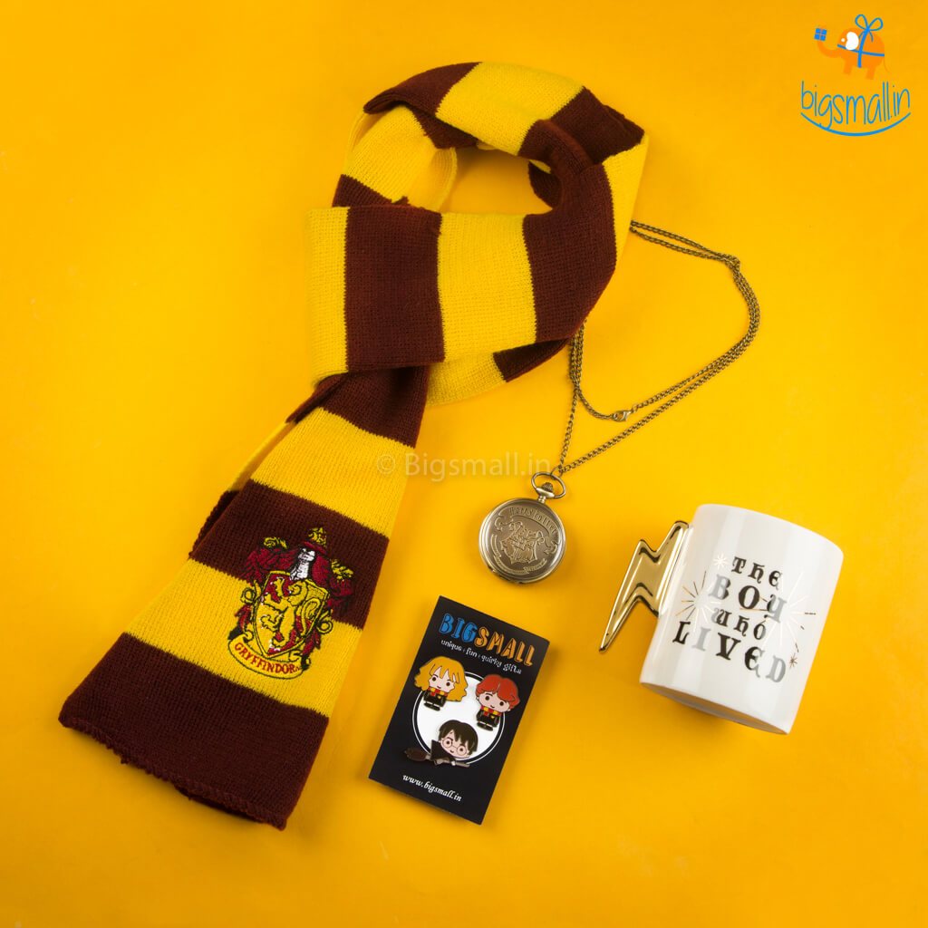 1 x Harry Potter Pocket Watch, 1 x Gryffindor House Scarf, 1 x Harry Potter Character Metallic Pins and 1 x 3D Harry Potter Bolt Mug