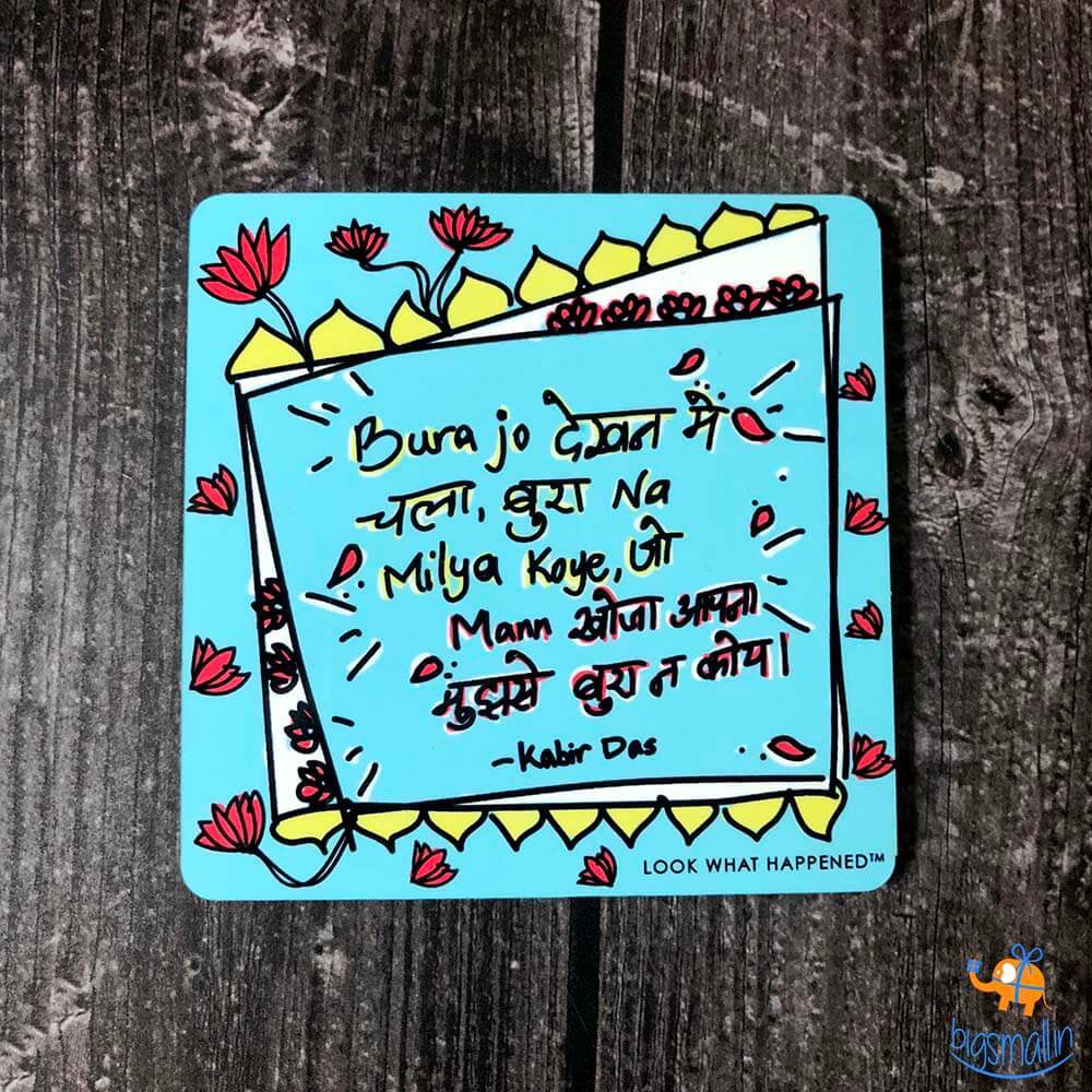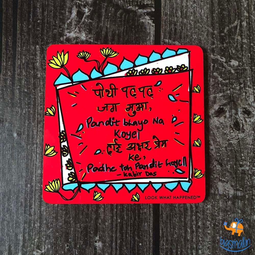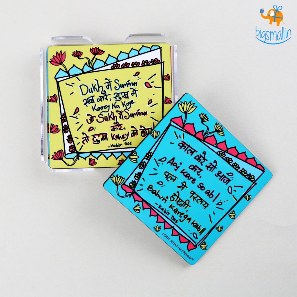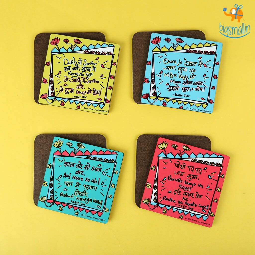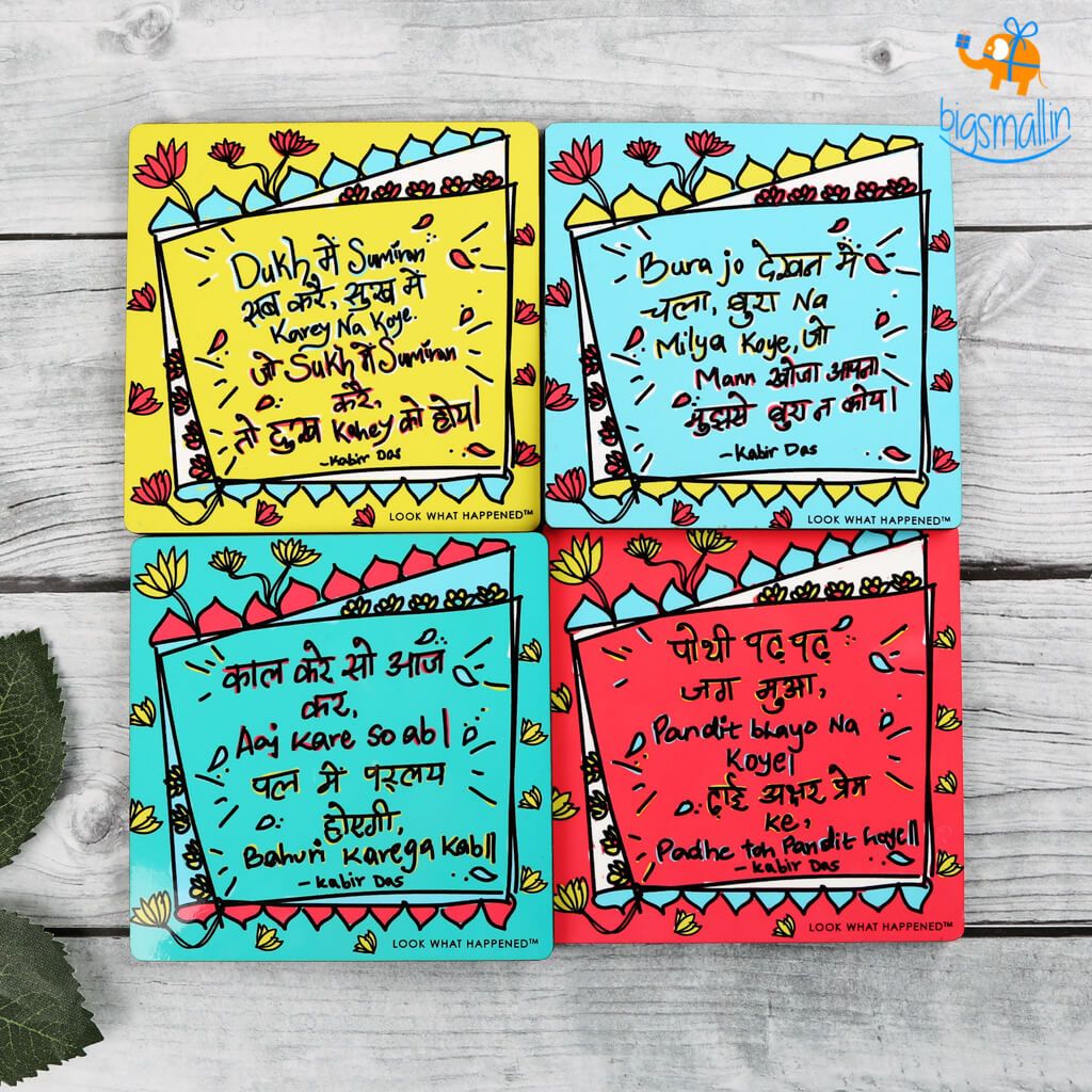 Add a wholesome learning experience while sipping your beverages with these glorious Kabir Dohe coasters! Available in sets of 4, each coaster has a different doha (couplet) inscribed on it - from the illustrious Indian poet and saint, Kabir Das. These dohas are legendary - each one is a story, words to live life by and lesson itself - enrich your mind while drinking your morning cup of joe! Extremely durable, these coasters are just as timeless as Kabir's works.