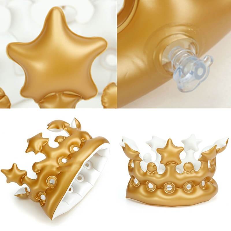 • Gold-colored inflatable crown - all you have to do is inflate it and beam it aloft on your head