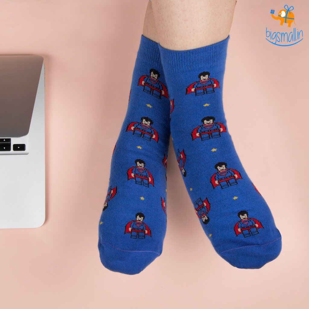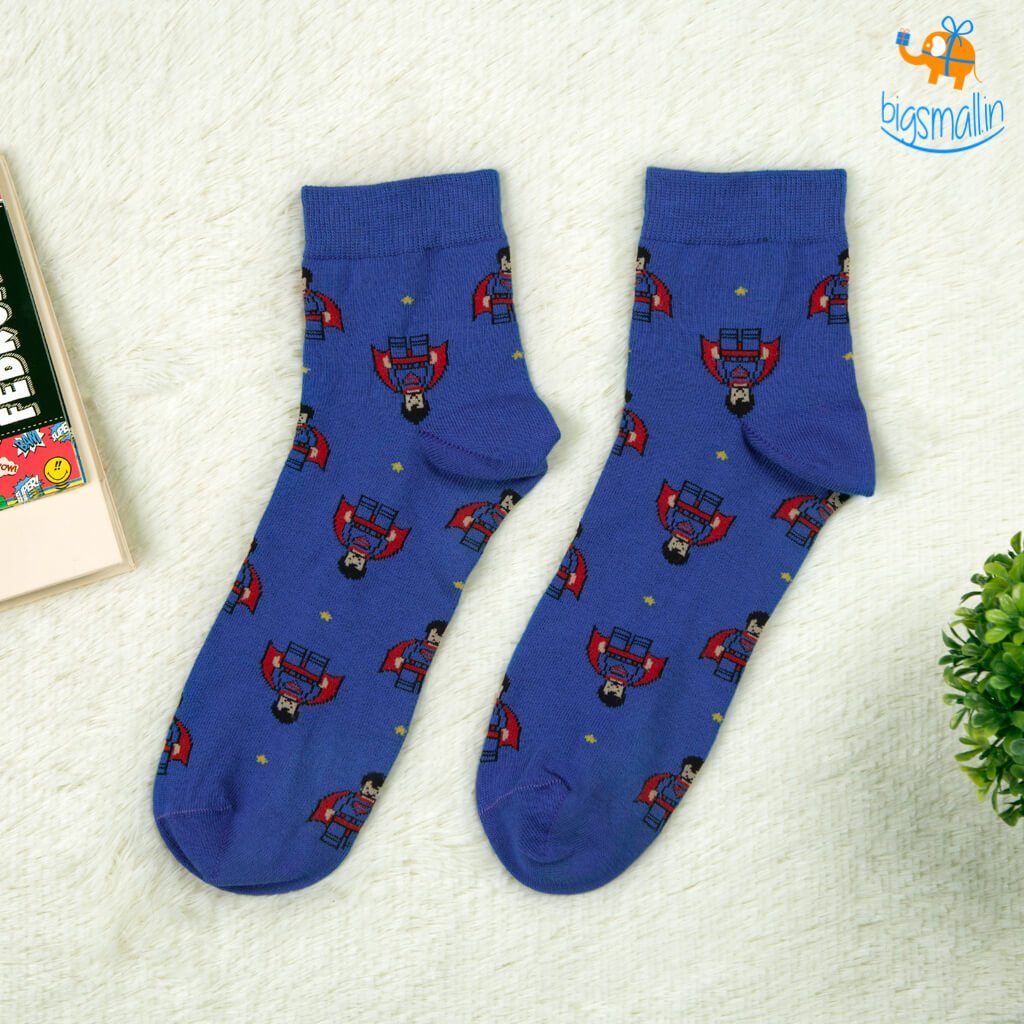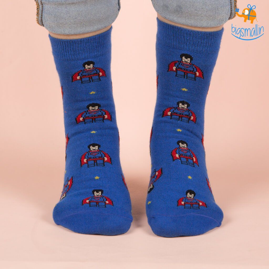 What's better than having the might and flight of Superman at your feet? It's the endearing look of Lego Superman. This Lego Superman cartoon socks will help you keep your feet warm with ease! The Man of Steel usually uses his superpowers to fight evil, but now, he will style up your feet with his indomitable grit. The superb ocean blue color with tiny imprints of Lego Superman is a delight to look at. Up the funk of your attire with this super cool socks. A must-buy for any Superman fan- Up, up and away!
