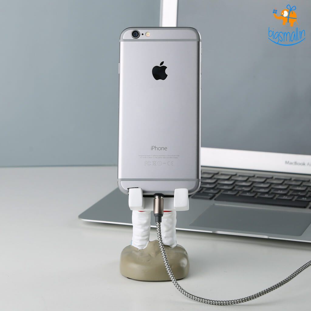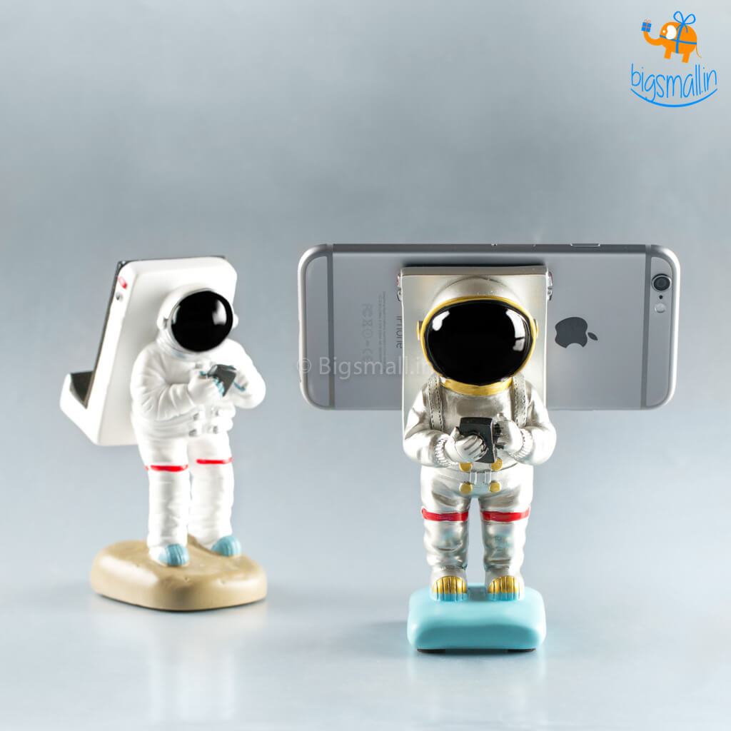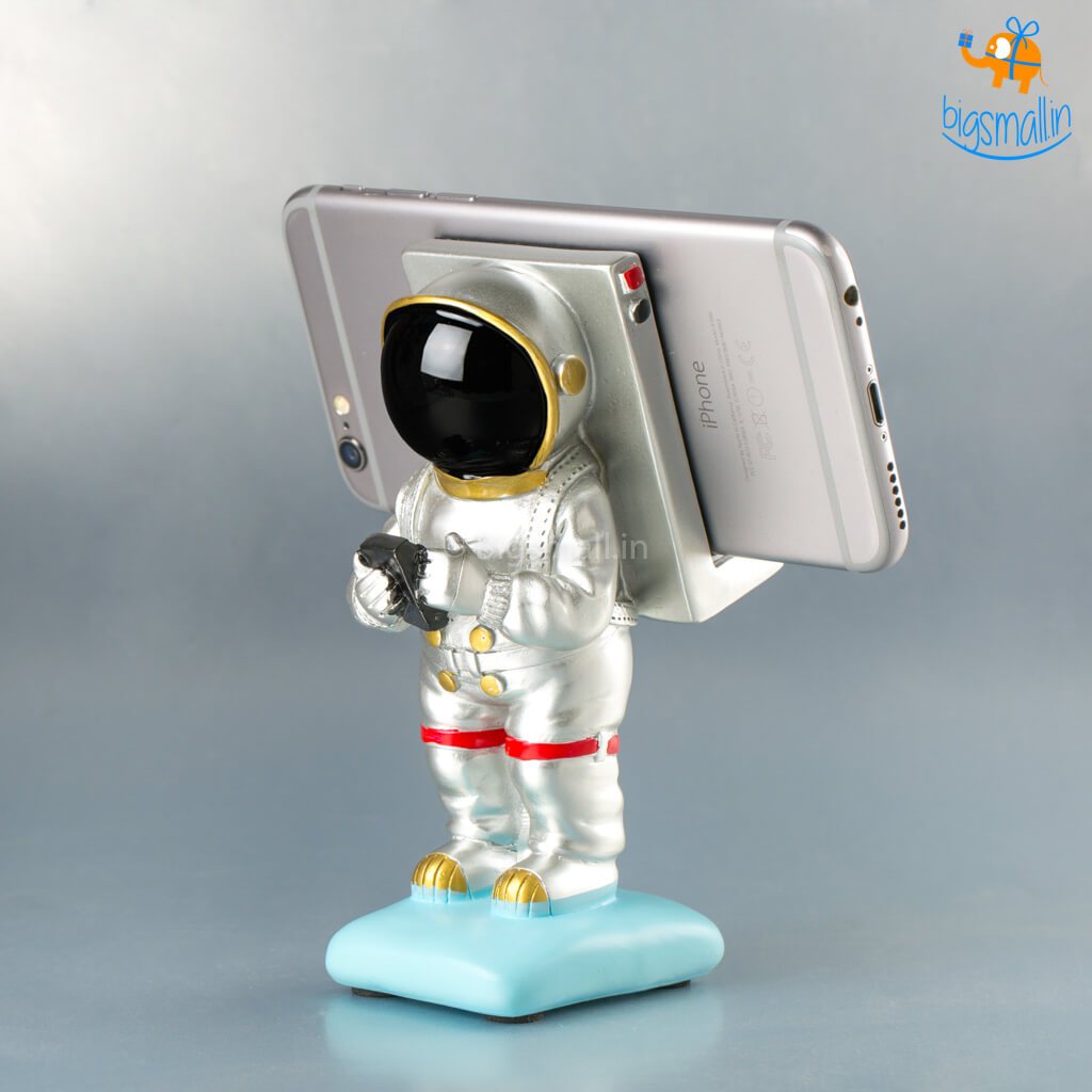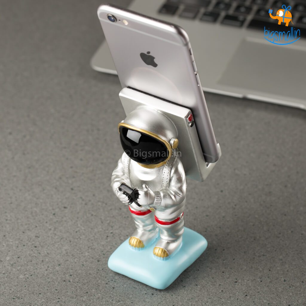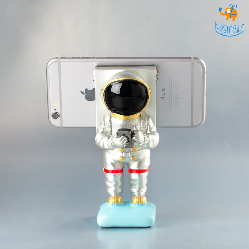 A creative phone stand in the shape of an astronaut, who is communicating with aliens on another planet (or moon). The phone stand is made of poly resin, that comes with shock resistance and a non-slip base. The stand can be used to place your phone or tab in either vertical or horizontal direction. Place the phone on the back side of astronaut and let is act as an oxygen cylinder for the astronaut. The stand acts a super cool tabletop figurine.