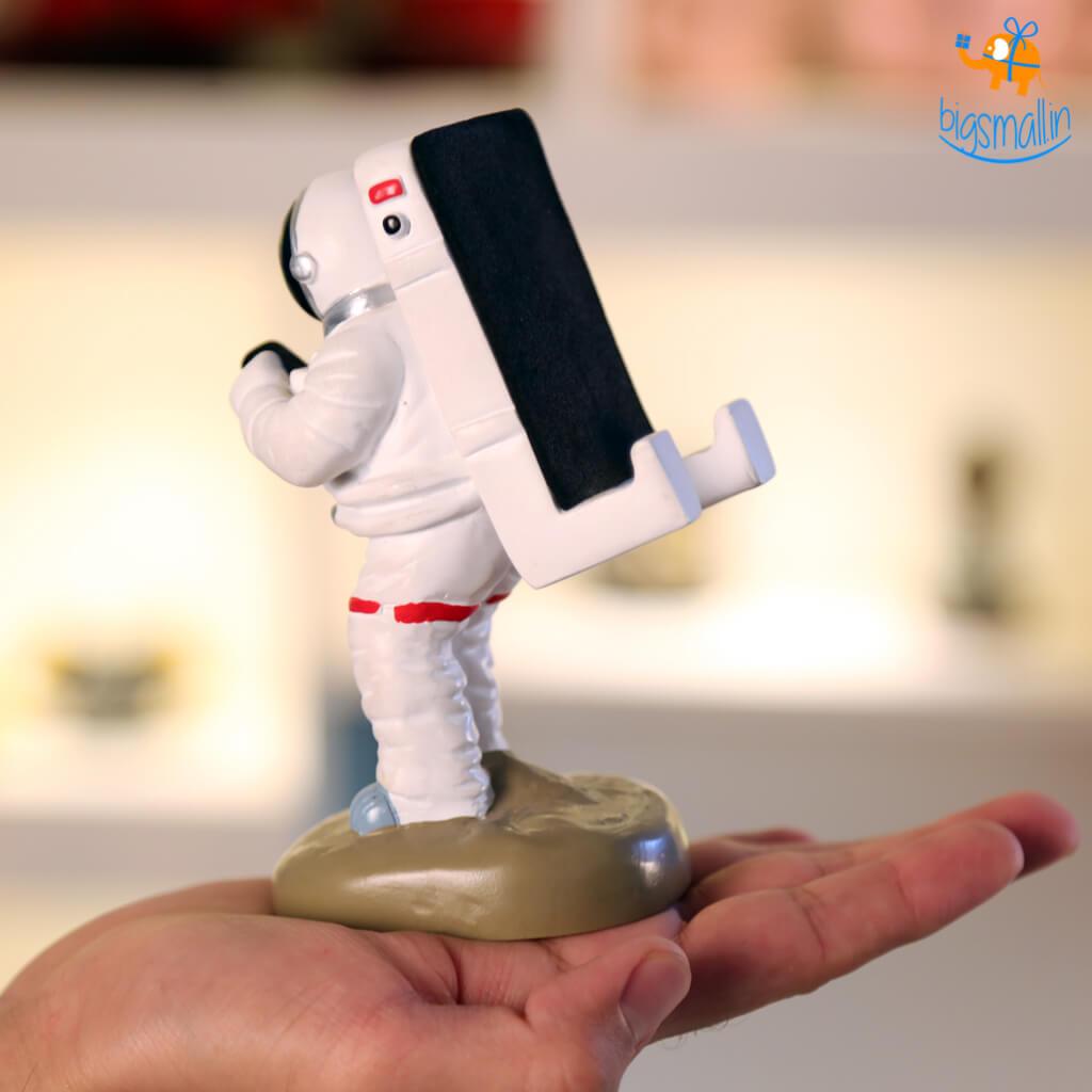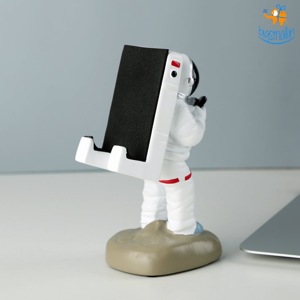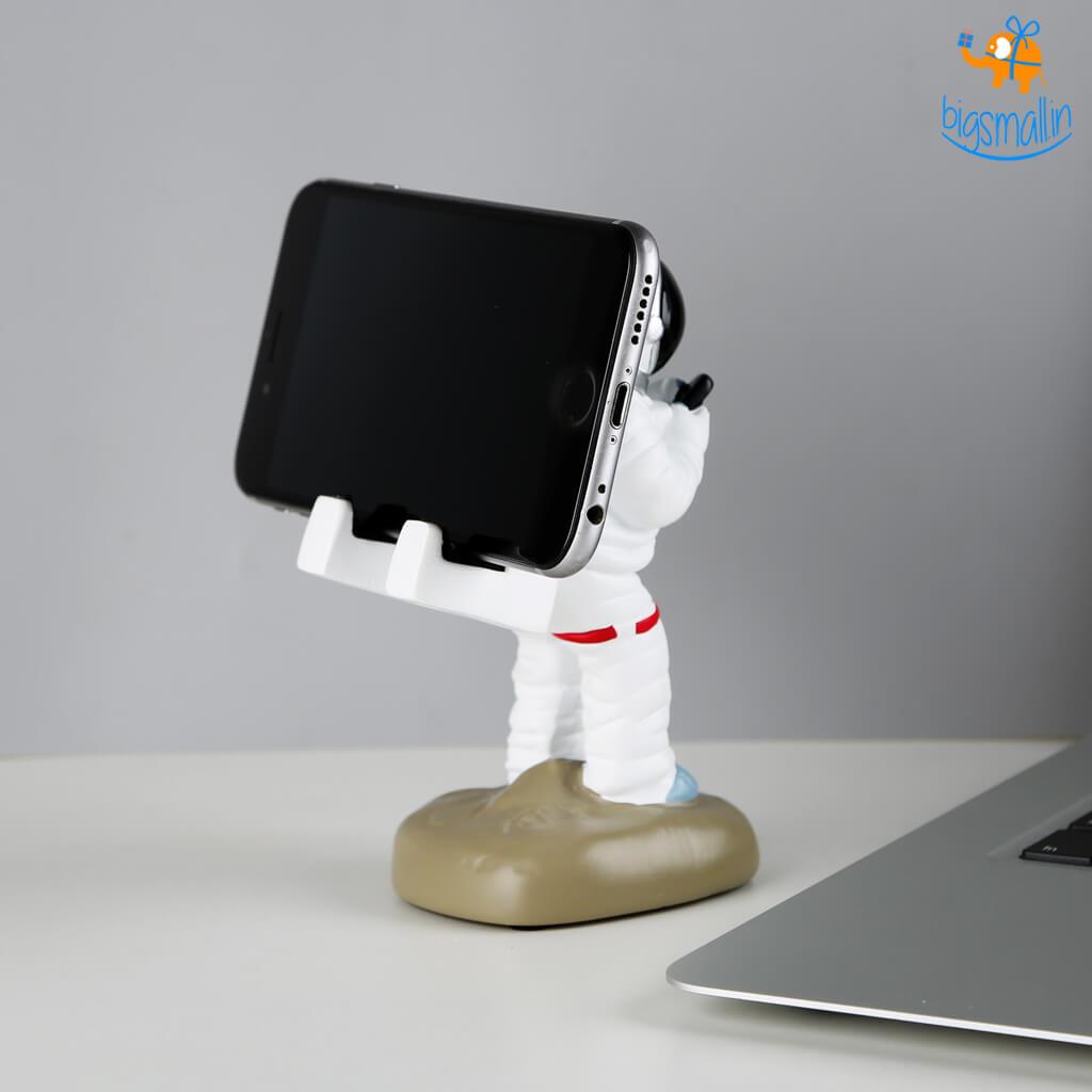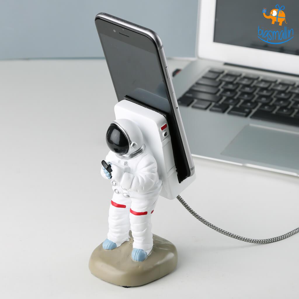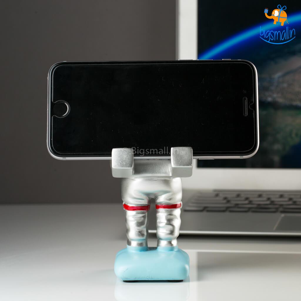 A creative phone stand in the shape of an astronaut, who is communicating with aliens on another planet (or moon). The phone stand is made of poly resin, that comes with shock resistance and a non-slip base. The stand can be used to place your phone or tab in either vertical or horizontal direction. Place the phone on the back side of astronaut and let is act as an oxygen cylinder for the astronaut. The stand acts a super cool tabletop figurine.