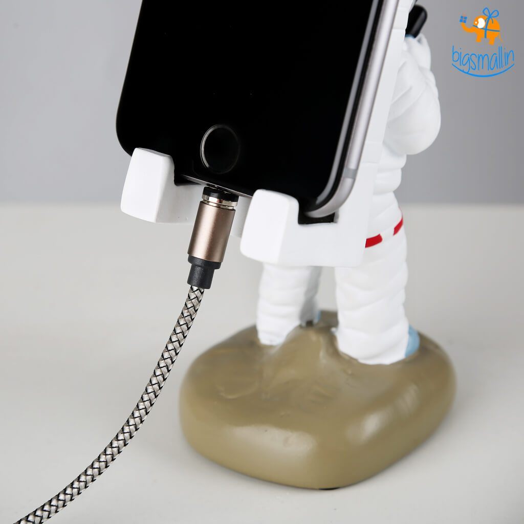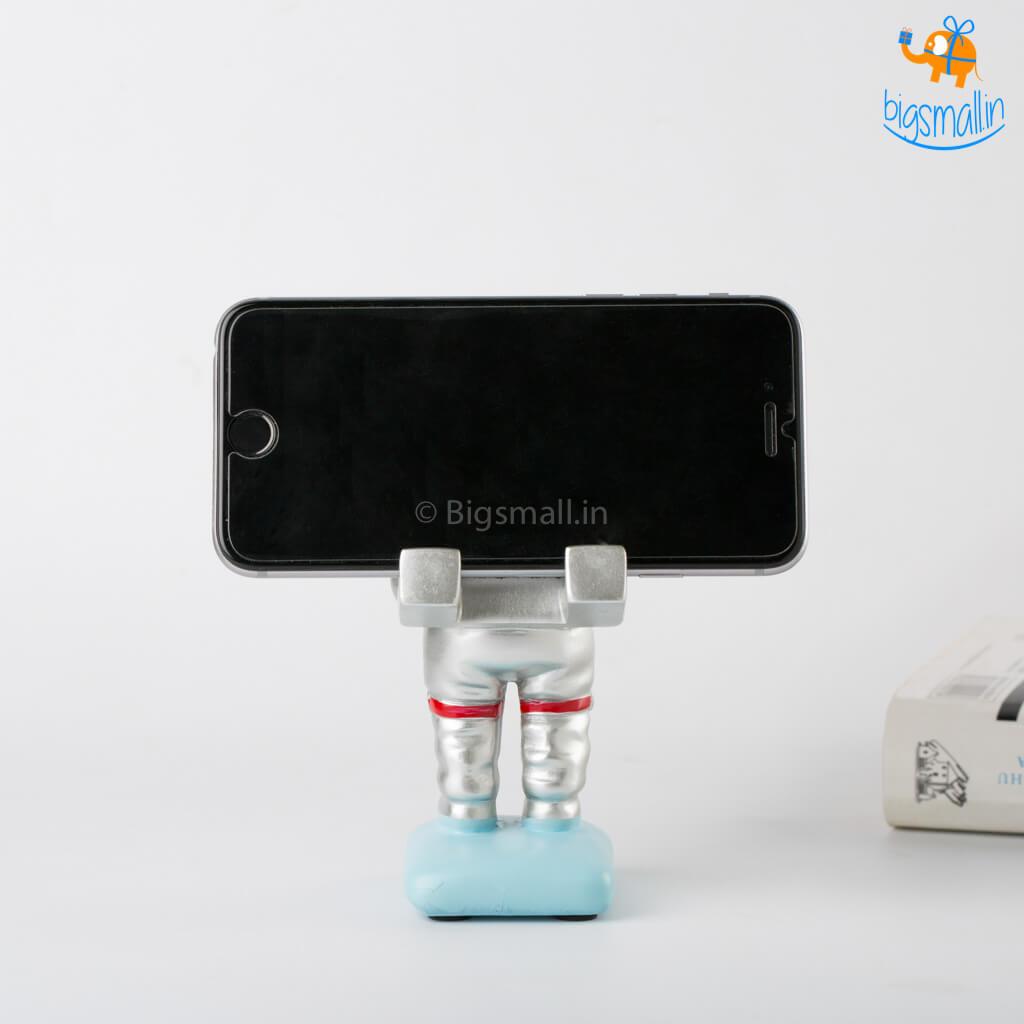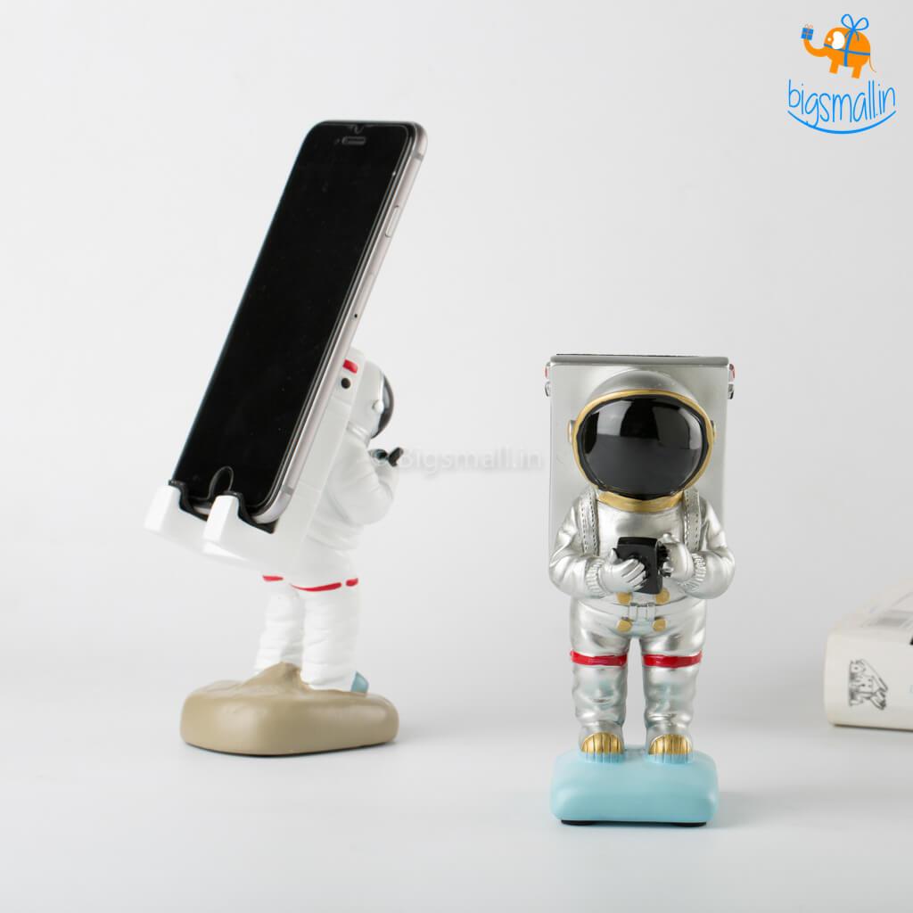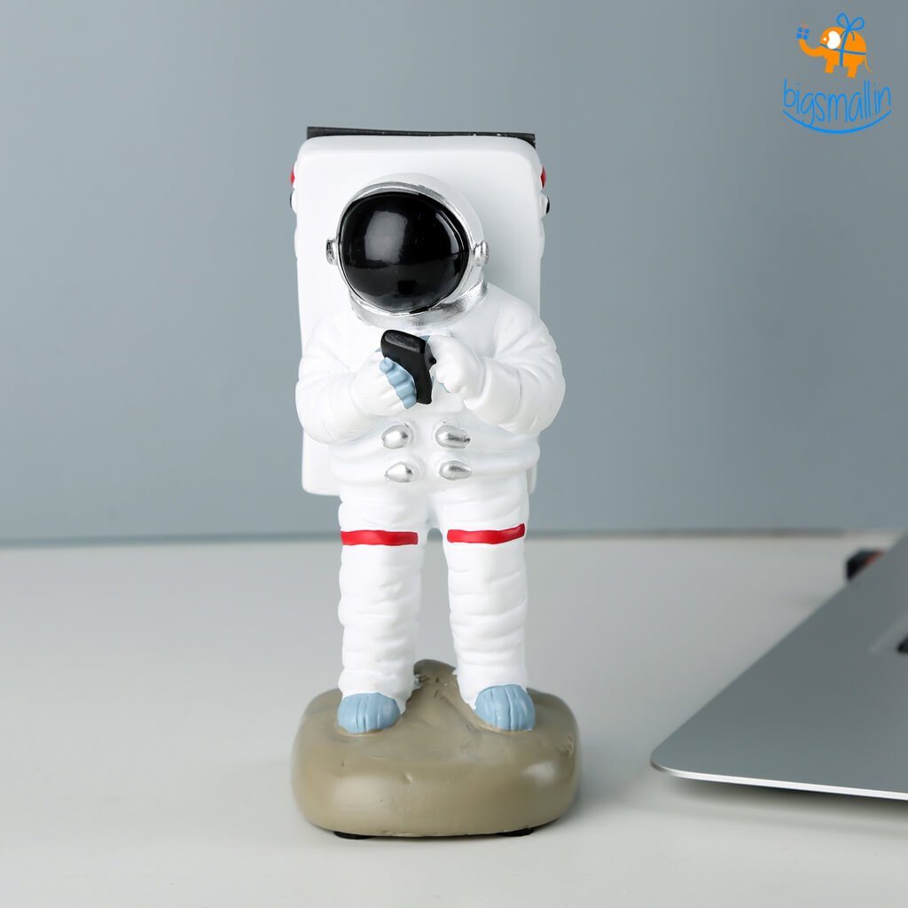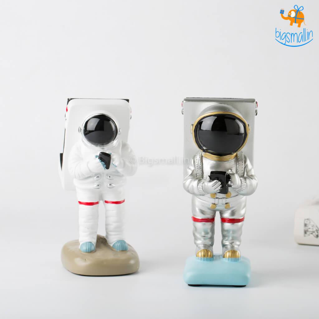 A creative phone stand in the shape of an astronaut, who is communicating with aliens on another planet (or moon). The phone stand is made of poly resin, that comes with shock resistance and a non-slip base. The stand can be used to place your phone or tab in either vertical or horizontal direction. Place the phone on the back side of astronaut and let is act as an oxygen cylinder for the astronaut. The stand acts a super cool tabletop figurine.