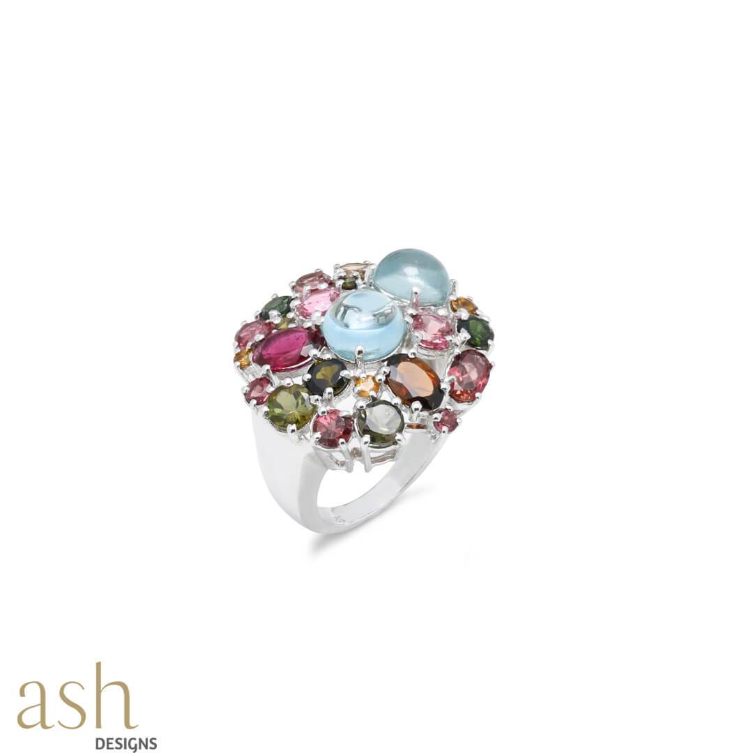 A stone for “new beginnings”, Moonstone is a stone of inner growth and strength. It soothes emotional instability and stress providing calmness. It’s also a wonderful fertility aid too. Moonstone Charm Ring features stunning round-cut tourmaline gemstones accentuated by moonstones set in silver. The cocktail ring is the perfect statement piece for a fancy night out or for a fresh summer look.