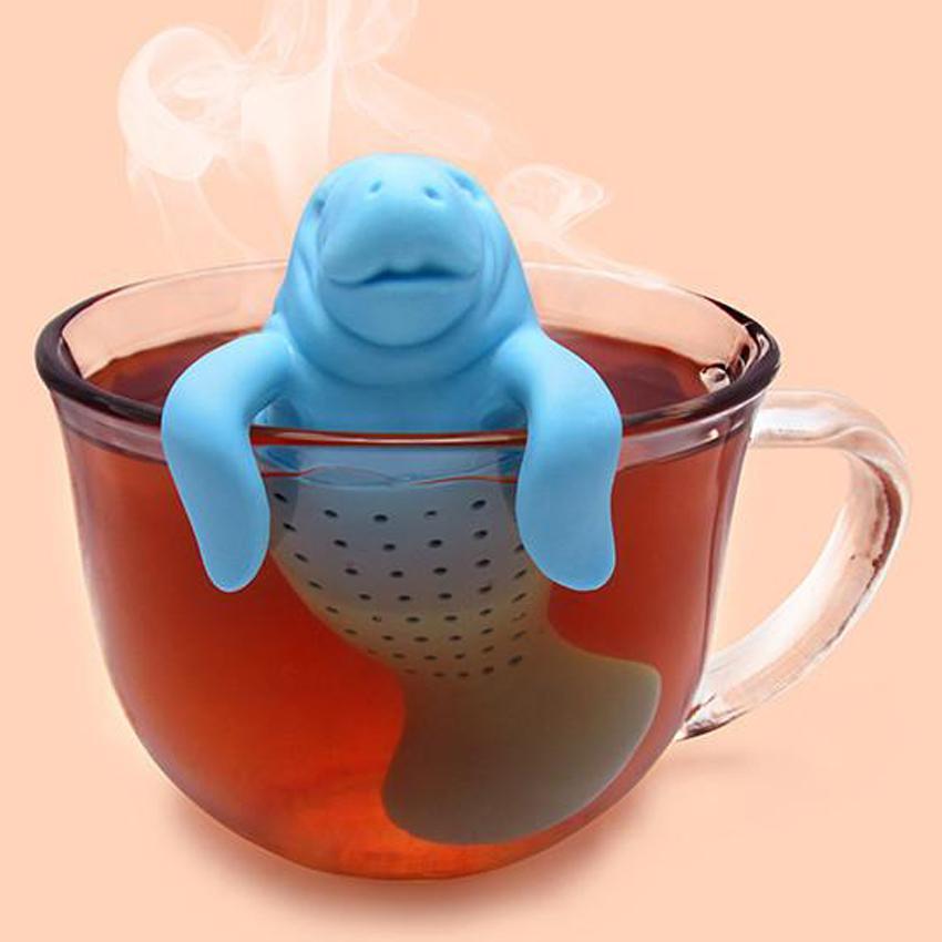Super cute tea infuser. The little manatee easily stays put on the rim of your mug. Use high-quality loose tea and practically none of the tea leaf particles escapes out and into the tea. Made out of silicone and they do not have any strong odour or add any taste to your tea.