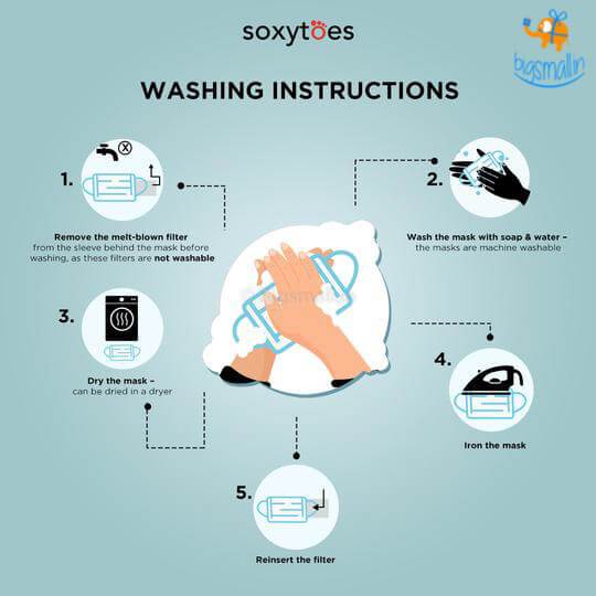 - Wash the mask with soap and water (can be hand washed or machine washed). We suggest washing the mask separately from the rest of your clothes.
