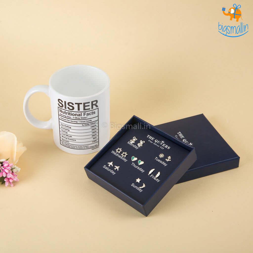 - Sister Nutritional Facts Mug and Weekly Earrings Gift Box - 7 Pcs