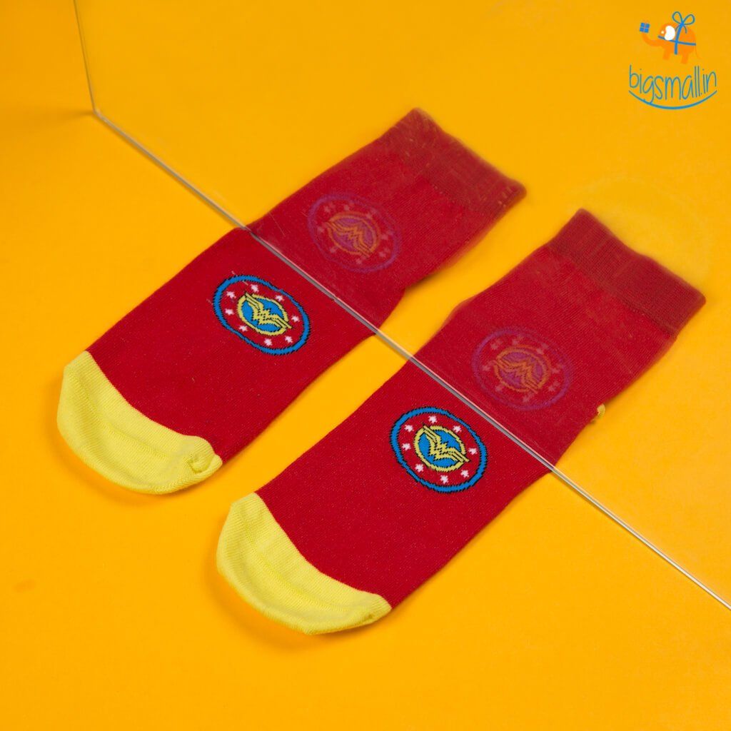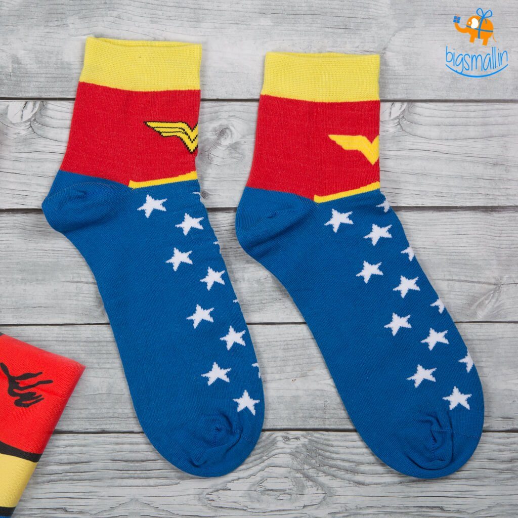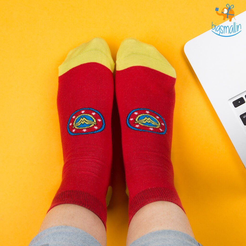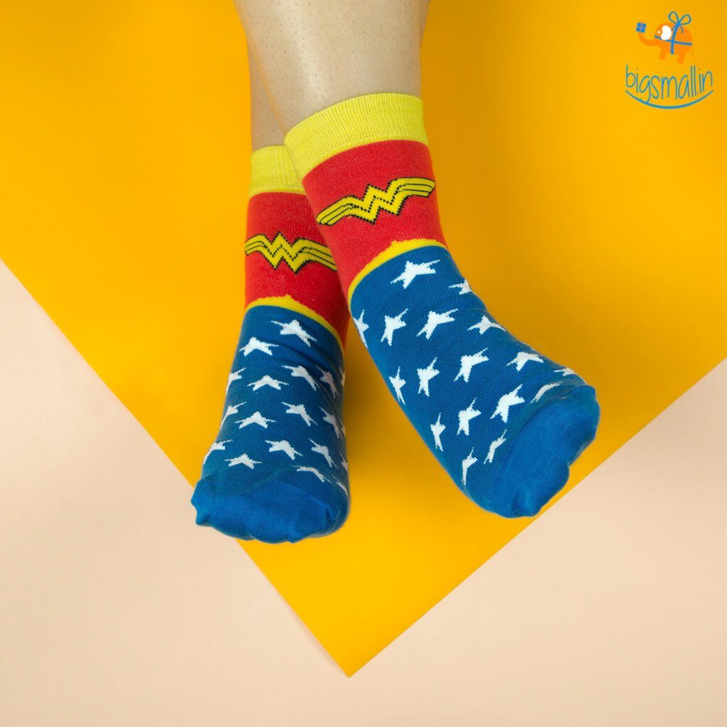 Wonder Woman has been a symbol of women world over, fighting for justice with her superhuman abilities. Every Wonder Woman fan will have wanted to don her attire - and now they can, with the Wonder Woman socks.Wonder Woman may be a fictional character, but she has given inspiration to millions of women around the world. These socks are great gift for wonder woman fans, hand knit with love from long lasting combed cotton and are available in free size. A well designed pedantry detailed socks to your casual outfit or a quirky add on to your formal dress.Bring the Amazonian power of wonder to your feet- with this Wonder Woman socks. Unleash the power of Princess Diana of the Amazons, who left her home to become Wonder Woman and save the world from war. An ideal gift for all girls who aspire to be wonder woman of their own lives.
